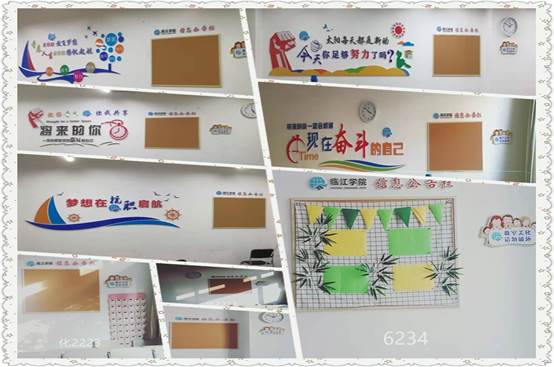 假如你踏入布置后的临江学院6号教学楼二楼、临江实训楼主楼、西辅楼的12间教室,一幅幅美丽的画卷即刻呈现出来,教室整体布置整洁而优雅,“青春在杭职放飞梦想,人生在杭职扬帆启航”、“将来的你一定会感谢现在不断奋斗的自己”等一条条催人奋进的标语展示在教室后面的墙上,这不仅是一种学习态度的宣誓,更是一种学习信仰的体现。在教室墙后的另一角,具有临江学院特色的“宣传、信息公告栏”则将学校信息、班级动态及时发布,也对校园贷、校园安全等警示信息广而告之,让同学们不错过一条重要的消息。据悉,临江学院还将不定期地在“宣传栏”中开展班级文化氛围评比工作,为每个同学提供展示自己风采的平台和机会,浸透出适合自身的班级文化,创造出各班不同的校园文化特色和学习文化氛围,并以此不断深化学生职业素养五个文明中的“课堂文明”与“日常举止文明”。