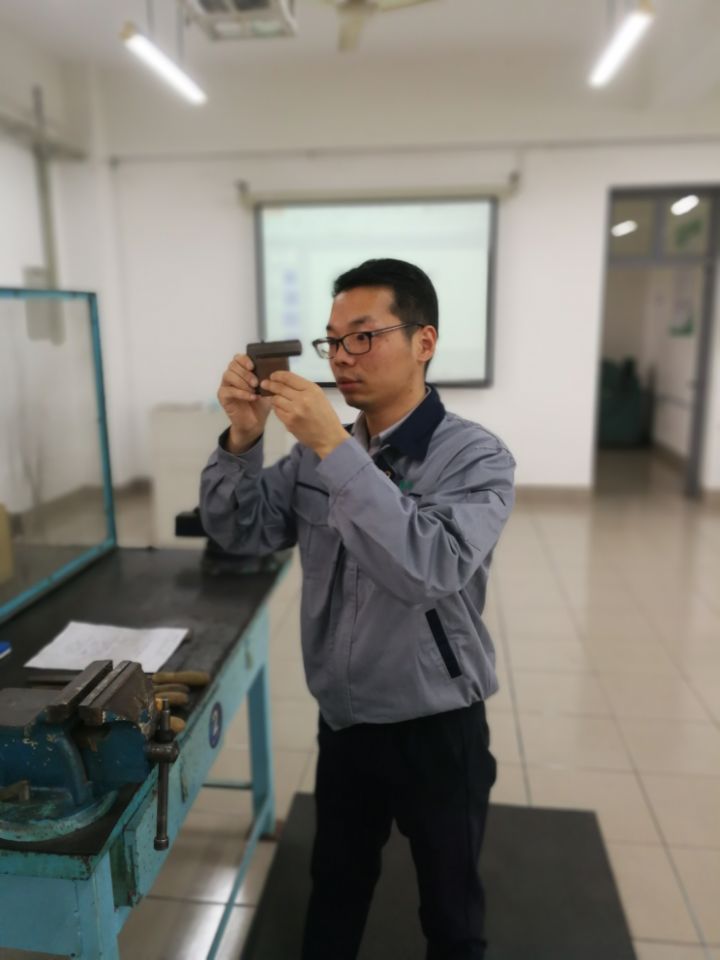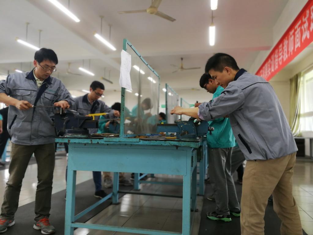 每逢周一、周四是青年教师崔学广、李国明、雷阳进行钳工实训的时间,技能指导老师陈楚在实训前结合教师的实际情况制定培训计划,实训中严格按照实训标准来指导老师们的技能操作,实训后按钳工考证标准来检验老师们的练习成果。在技能指导老师的高标准严要求下,三位参与培训的老师钳工专业技能进步明显,并且纷纷表示这样的技能培训对提高自身的专业能力非常有必要。