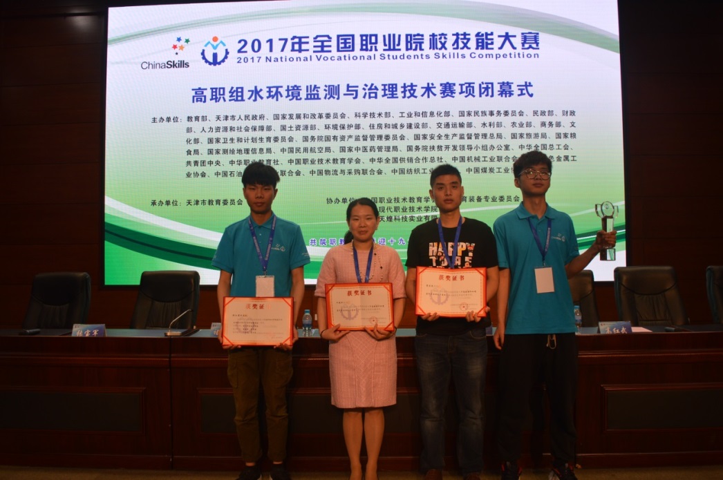 5月12日至14日,2017年全国职业院校技能大赛高职组“水环境监测与治理技术” 赛项在天津现代职业技术学院隆重举行,共有全国20个省的65支代表队参加比赛。来自我校临江学院环境工程技术专业代表队发挥出色,喜获团体一等奖,取得该赛项我校及浙江省历史最好成绩。干雅平、蒋立先两位指导教师获优秀指导老师奖。