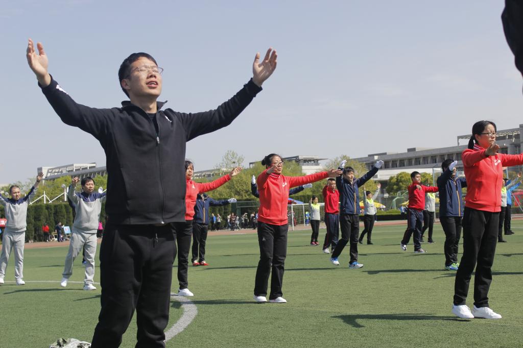 第一个项目是广播体操团体秀。走下讲台,放下教鞭,一身运动装的老师们昂首阔步,踏着整齐的步伐,精神饱满地进场亮相。在昂扬的音乐声中,教工们个个朝气蓬勃,动作规范整齐。一张一弛之间,用广播操表演和迷人的微笑彰显了杭职教职工的青春活力。