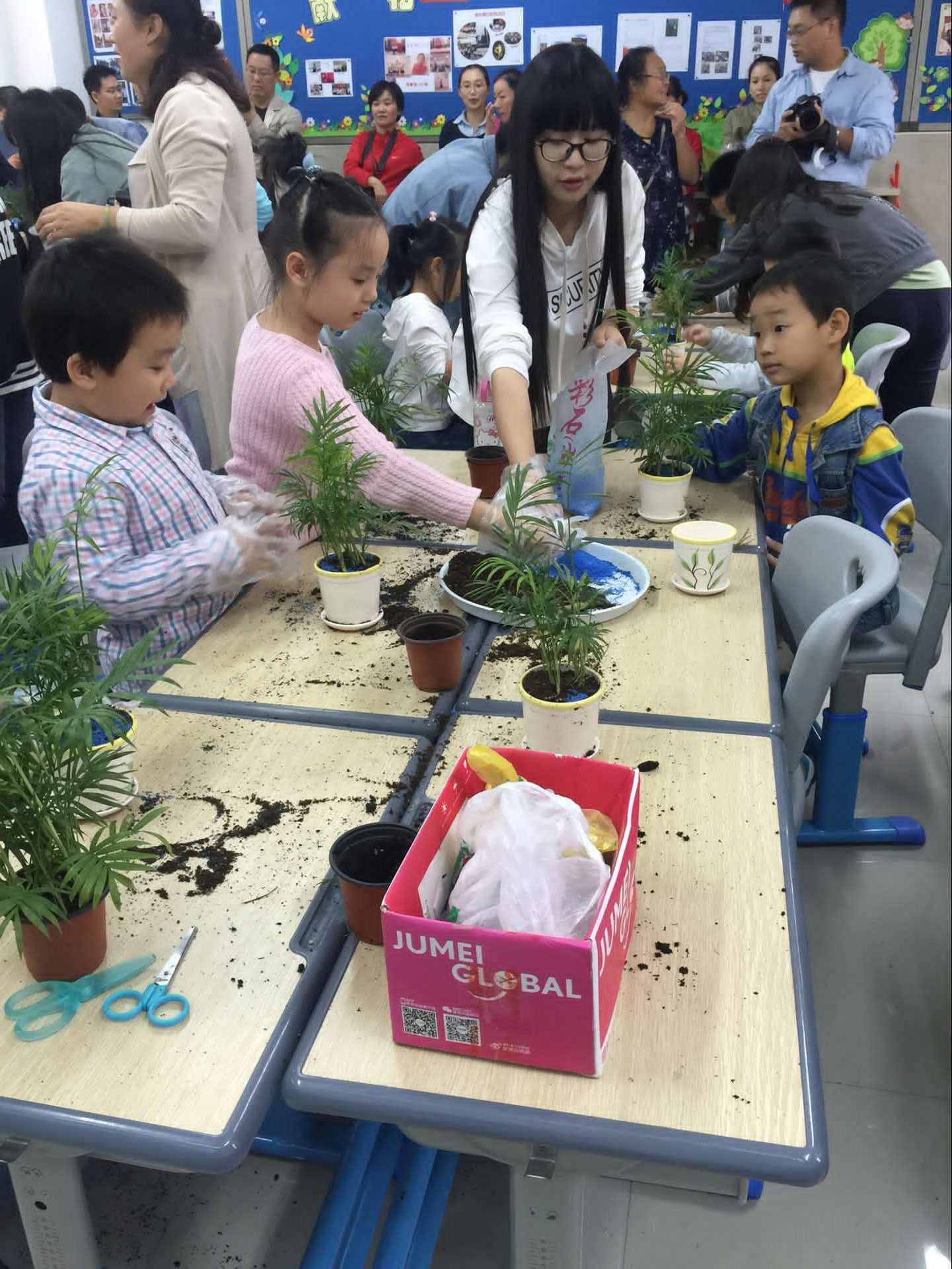园艺的同学们早早来到活动场地,准备好了工具和植物材料。小朋友们在家长的带领下来到教室,在听完小老师的讲解后,迫不及待的分组开始操作起来,园艺的同学们则耐心的手把手的一一指导。家长们纷纷用手机和相机记录下了大家的欢乐瞬间。在完成袖珍椰子小盆栽后,园艺的同学们以身作则,引导小朋友整理好自己的工作台面,打扫好教室,将课堂中养成的良好职业习惯延伸到课外活动中。